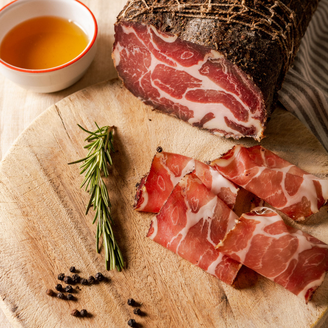 Realizzata a partire dalla carne dei nostri suini allevati allo stato semibrado. L'alimentazione naturale integrata con il siero del nostro latte dona alle nostre carni suine un sapore ed una marezzatura eccellente ulteriormente esaltato dal nostro mix di erbe aromatiche e spezie.