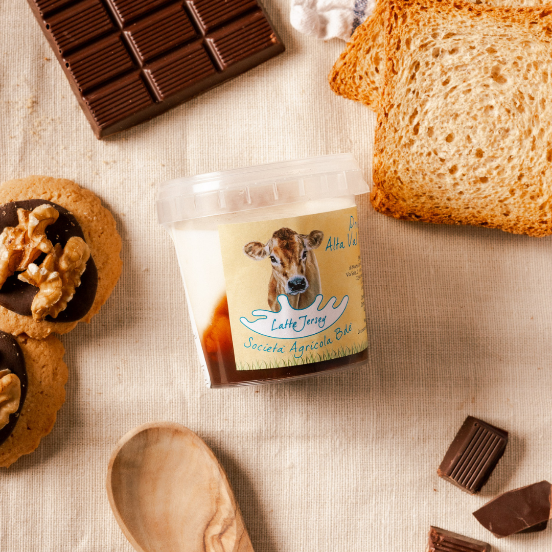 Tra le montagne della Val Comelico, nasce un incontro goloso: il profumato latte fieno delle nostre mucche Jersey abbraccia il sapore intenso delle fave di cacao.